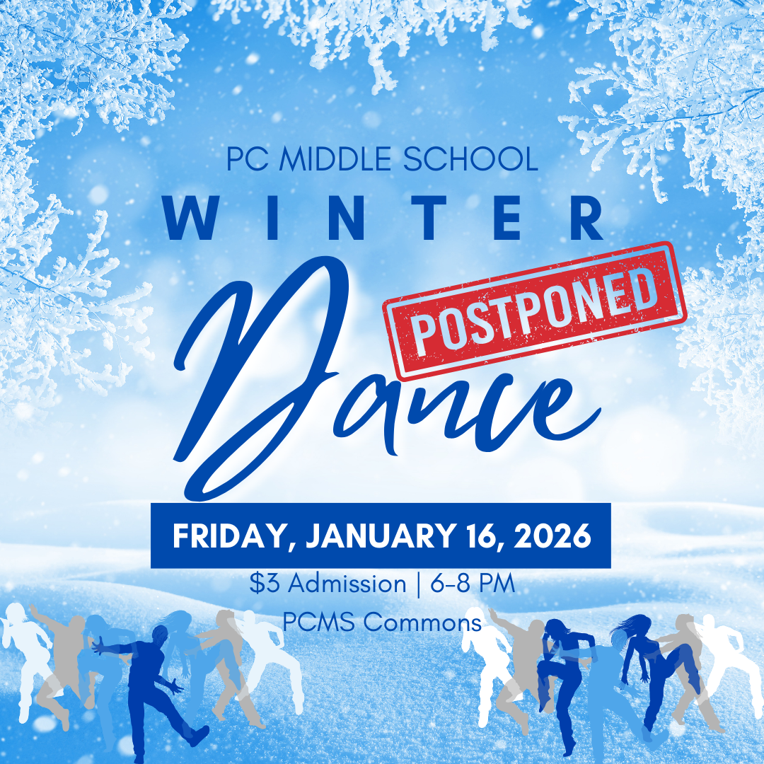 Due to impending weather, the Middle School Dance scheduled for this evening, Friday, January 16, from 6-8 pm has been postponed.